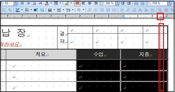6.이번에는 계정과목/지불처/적요에 해당하는 셀모두 마우스로 불럭을 잡고-> 가로 눈금자에서-> 오른쪽 여백과 왼쪽 여백을 조금씩 늘여줍니다.(글자가 선 가까이 붙는 것을 막기 위해서 입니다)