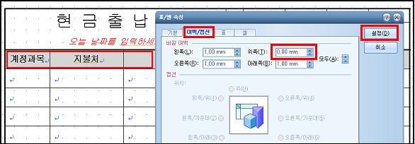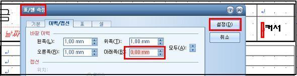 3.다음은 아래 출납부를 기록하는 양식을 만듭니다. *결재란 맨 오른쪽에 커서를 이동시킨후-> Ctrl+N=K키를 눌러-> [표/셀 속성] 대화상자가 나오게 한 후-> 바캍여백/ 아래쪽에 0.00mm로 바꿔-> 설정단추를 클릭합니다. *이는 결재란 표와 이어서 그려줄 표사이 간격을 좁혀주는 작업과정입니다.