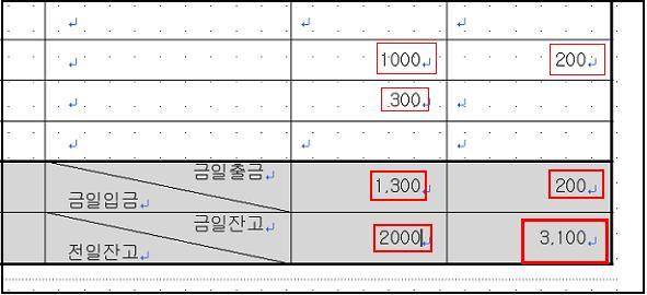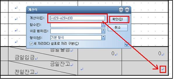 11.다음은 그 아래 금일잔고 셀에서-> [표]-> [계산식]을 클릭-> 계산식 대화상자에서-> 다음과 같이 입력합니다.(=d29-e29+d30) *즉 금일입금액-금일출금액+전일잔고를 계산하면 금일의 잔고가 나온다는 계산식입니다.