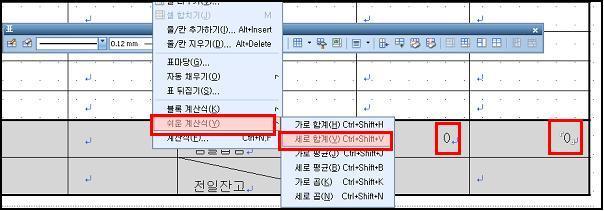 10.금액이 있는 위에 합계셀에서 [표]-> [쉬운계산식]-> [세로합계]를 선택합니다.