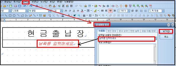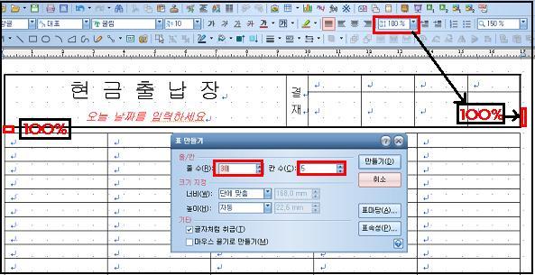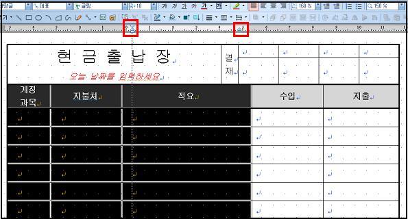 2.결재란이 있는 상단 문서부터 만듭니다. *표 아이콘을 선택-> 2줄 6칸 표를 그립니다.-> 그런후 세로 경계선을 드래하여 옮겨-> 결재란 6칸 간격을 조정합니다. *왼쪽 첫째칸에 Shift를 눌리고 드래그하여-> 현금출납장이란 글자가 들어갈 공간을 넓혀주고고-> 윗줄에는 [현금출납장]입력-> 글자크기= 20포인트/ 글자속성=진하게/ 가운데정열을 적용합니다. *두째줄에는-> 메뉴에서 [입력]-> [문서마당 정보]를 선택하고-> 대화상자에서 [오늘 날짜를 입력 하세요]라고 입력한 후-> [닫기]단추를 클릭합니다.