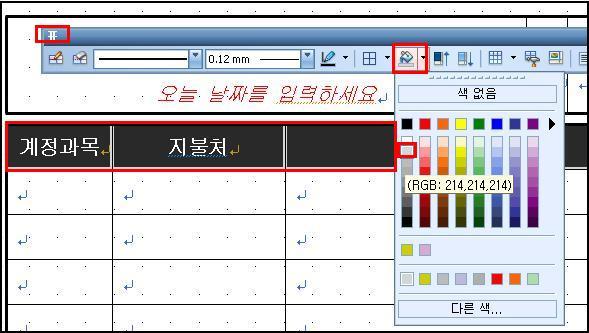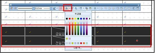 9.그리고 마지막 두줄을 모두 불럭을 잡고-> L키를 눌러 위에 있는 가로선 굵기를 0.5mm로 설정해 주고 *표 도구상자에서-> 셀 배경색을 선택해-> 색상을 줍니다.