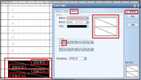 8.다음은 적요란의 맨아래 2줄에 [금일출금]입력하고-> 오른쪽 정열/ 앤터치고 [금일입금]입력학고-> 왼쪽 정열/ 아래줄에 [금일잔고-> 오른쪽 정열/ [전일잔고]입력하고-> 왼쪽 정열합니다. *불럭을 모두 잡고-> [L]키를 눌러-> 셀 테두리/배경 대화상자에서-> [대각선]탭을 선택하고-> 대각선을 그림과 같은 유형을 선택하고-> [설정]단추를 클릭합니다.