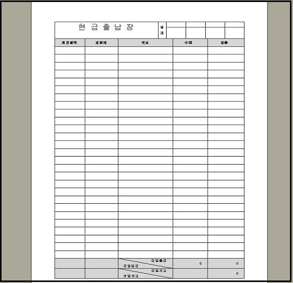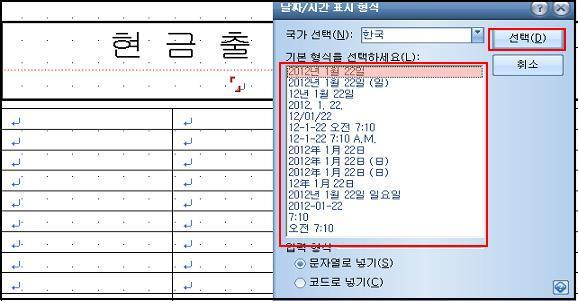 *안내문이 입력되면 가운데 정열을 합니다. 편리하게 오늘날짜를 자동으로 날짜가 입력되게 하려면-> [입력]-> [날자/시간]-> 날자/시간표시형식 대화상자에서 원하는 형식을 선택합니다. *그리고 왼쪽 현금출납장 2줄을 불럭을 잡고-> [L]키를 눌러 [셀 테두리/배경]대화상장에서-> 가운데 선을 없애고-> *표에서 F5키를 두번 표전체를 불럭을 잡고-> 바같 테두리를 0.5mm선택하고->굵게 설정합니다. 이렇게하여 상단 결제란과 제목을 완성합니다.