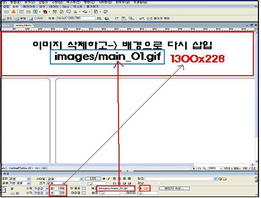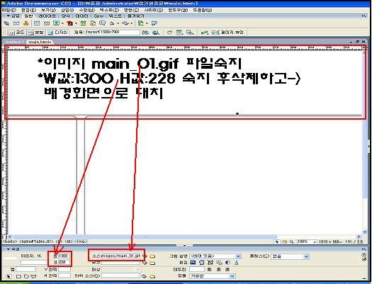 3.이미지를 삭제한후 *아래 속성창에서-> 위에서 메모해 둔 W와 H값을 입력하고-> *배경 경로를 찾는 공란의 노란 폴더를 클릭하여-> 저장된 이미지를 찾아-> 열기하면-> 배경하면으로 채워집니다.. *다시 말하지만 배경으로 채워지면-> 화면이 확대 될 경우 이미지가 연속으로 깔리기 때문에 깨지지 않는다는 것입니다. *그래서 일반 이미지를 배경이미지로 바꾸어 주는 것입니다. 중요합니다....
