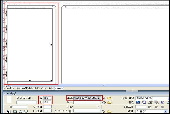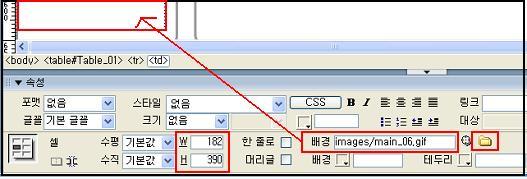 2.그림에서 보면 잘라진 부분은 없어 보이지만 사실은 잘라져 있는 형태로 이어져 있습니다. *상단부분 메뉴가 들어갈 부분을 클릭했는데 잘라진것을 확인이 가능합니다. *지금은 이미지(그림)파일로 삽입되어 있는 상태로 그냥 업로드하면 화면이 깨질수 있습니다. *따라서 그림파일로 삽입된 이미지를 삭제하고-> 배경화면으로 대치해야합니다. *포토샵에서-> Slice작업한 아래 이미지 main.html의 이미지는 개인마다 조금씩 이미지 수(번호)가 다를수 있습니다. *아무튼 Slice작업한 아래 이미지를 클릭하면 아래 속성창에 잘라진 이미지의 크기와 이미지 파일명이 나타나면 메모해 두고-> 이미지를 삭제합니다.