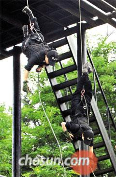 부대원들은 7m 정도 되는 외줄도 가뿐하게 올랐다. 기자는 시계추처럼 매달려 용을 쓰다 내려왔다. 오후 훈련은 레펠 훈련을 시행했다. 이들은 일주일 단위로 레펠·사격·위장술·미행감시·중요지역연구 등의 과목을 훈련한다.