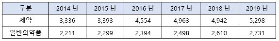 - OTC로 알려진 일반 의약품(Over The Counter) 시장도 2014년부터 5년 간 연 평균 4.31%씩 상승하여 2019년 26억 달러 규모로 파악(Statista)