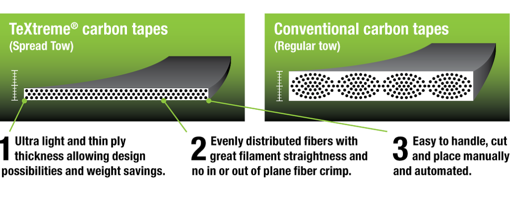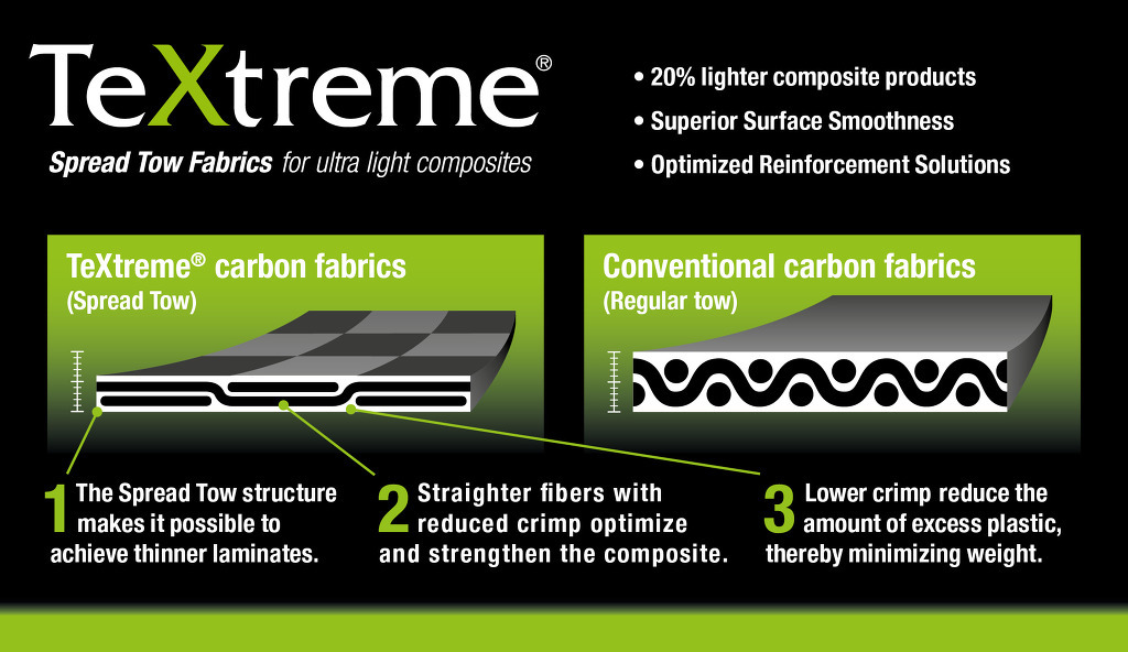 The special TeXtreme Spread Tow Carbon is flexible in only one direction, either flexural or torsional, making it possible in the manufacturing process to adjust and improve the ball trajectory and speed to accommodate playing style. The two layers of carbon are applied in a 45 degree angle or a 90 degree angle.