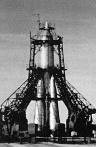 스푸트니크 2호 발사(1957. 11. 3), 카자흐스탄 튜라탐 우주 기지의 발사대에 있는 유상하중 보호덮개의 모양이 독특하다. 파이프를 통해 캡슐로 들어간 따뜻한 공기로 인해 최초로 생명체인 ‘라이카’라는 개를 태우고 몹시 추운 기온 속에서도 편안하게 궤도에 도달할 수 있었다.