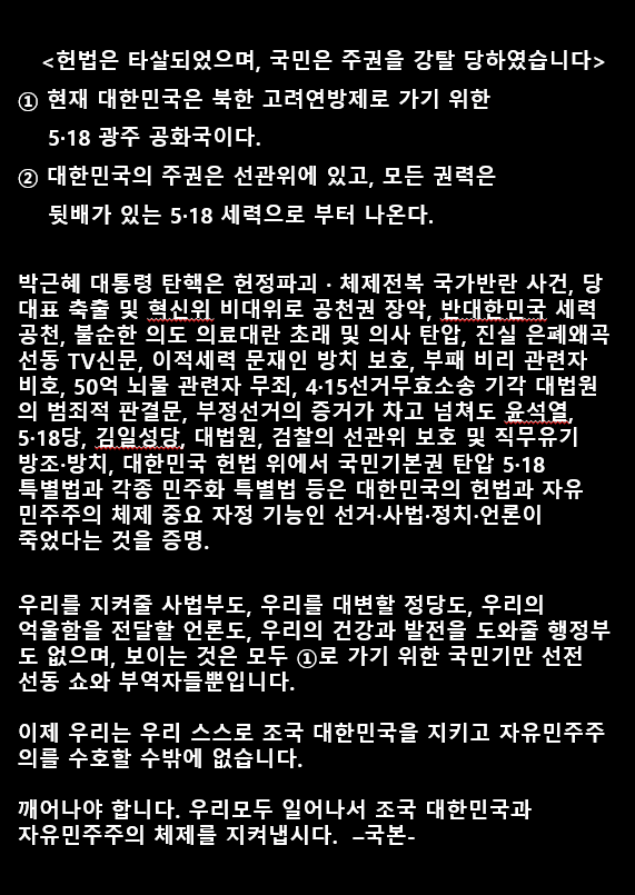 ■ 4.10 총선의 부정선거를 막지 않은 윤석열 한동훈 이재명에 의하여 자유 우파 국민은 주권을 강탈당하였으며 빼앗겼습니다. 윤석열 문재인 한동훈 이재명 국민의힘 더불어민주당 모두 한통속 같은 편입니다. 이들의 목적은 북한 살인독재 연방제 목적 5.18광주 내각제 개헌입니다. 자유대한민국 세력이여 총단결하여 대한민국을 지키고 자유민주주의 체제를 수호하자