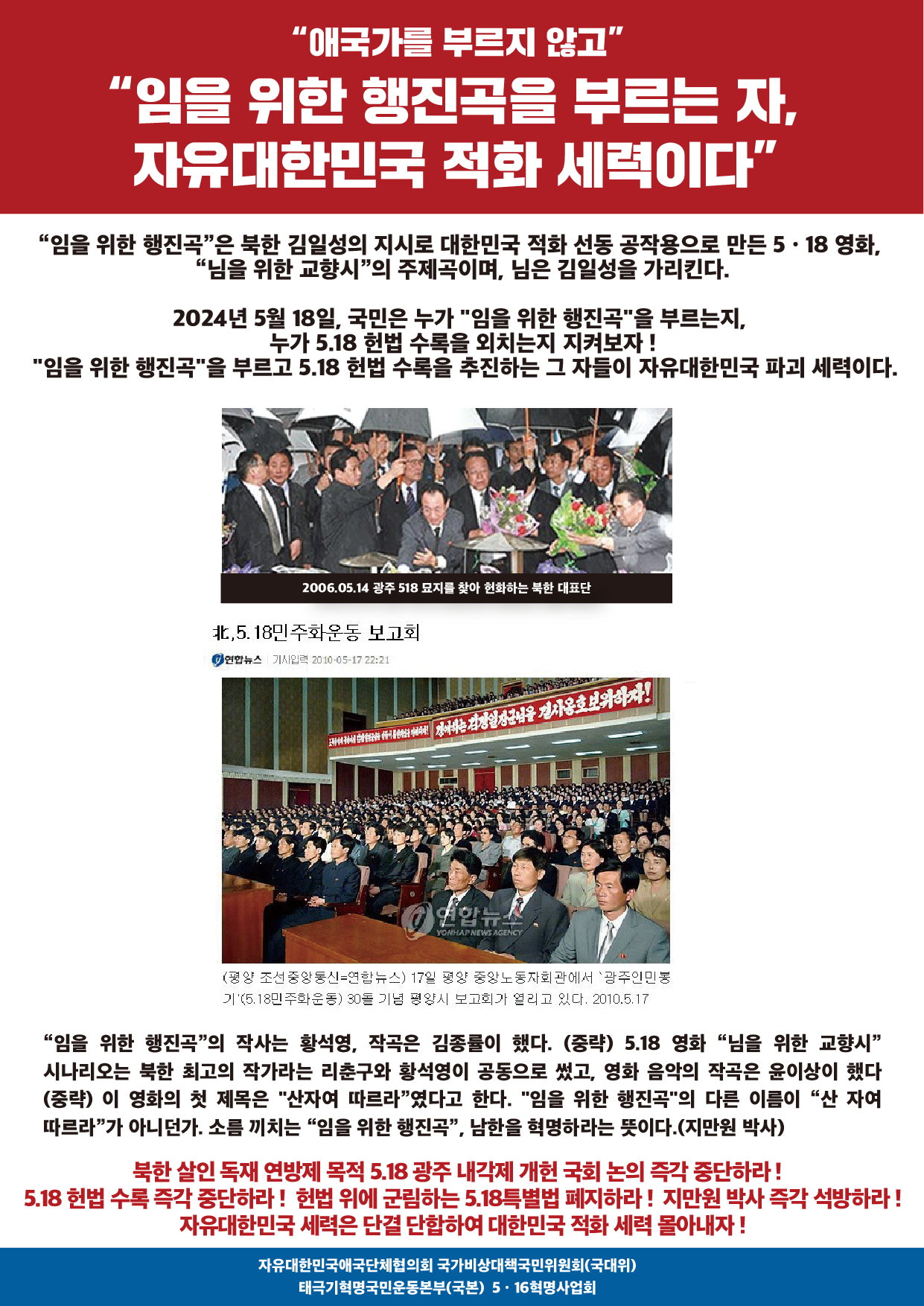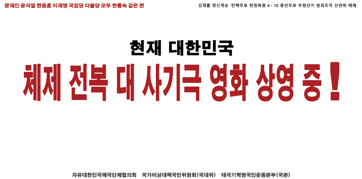 ■ 국민의힘 당 대표 한동훈 선출 유감 / 대한민국 건국 없는 국민의 힘 당헌 강령 / 민노총 등 종북 세력과의 전쟁을 준비하자 / 문재인사람윤석열은 자유대한민국의 대통령인가? / 부정선거 범죄 조직 선관위 해체 / 부정선거 반국가 세력 22대 불법 국회 해산 / 강탈 당한 주권을 찾아오자 / 탄핵무효 헌정복원 국민대회