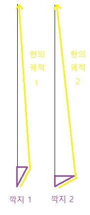 다음의 그림은 깍지의 길이에 따른 현의 궤적을 과장되게 표현한 그림입니다.