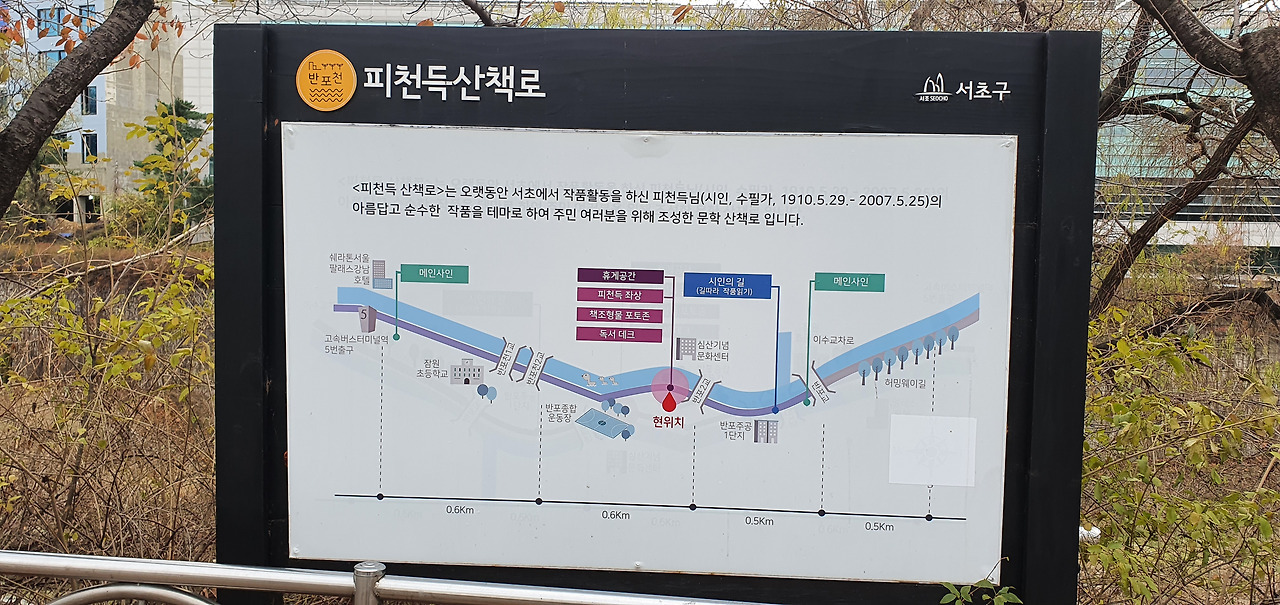 작년 9월 중순에 서초구 반포천 일대 피천득산책로와 하천길로 한강 유역까지 산책했다. 지하철 고속버스터미널 역 5번 출구로 나서면 피천득산책로 입구와 만난다. 반포천은 우면산에서 발원한 하천으로 한강으로 흘러가며, 이 하천이 포장되어 도로로 이용되고 있다. 가톨릭대 서울성모병원에서 대각선 방향에 산책로 입구가 보인다.