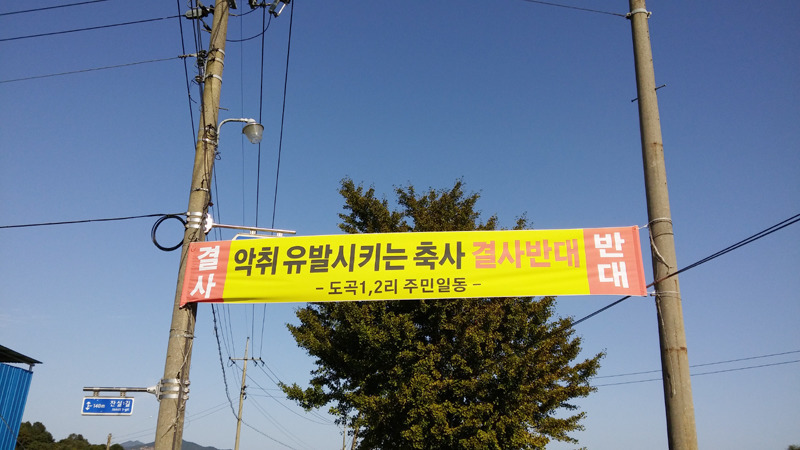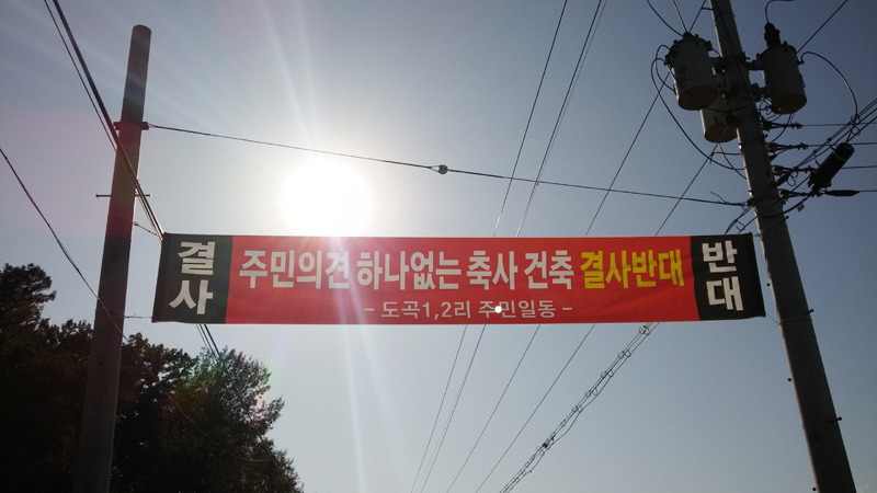 ‘태양광 결사반대“, “주민동의 없는 축사 결사반대”, “부리면 폐기물 처리장 반대”