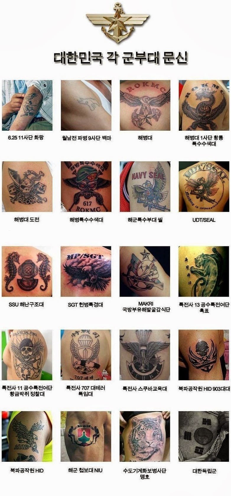대한민국 군부대 문신종류! 작성자#613 이상엽/수원|작성시간14.04.10|조회수1,474 목록 댓글 0 글자크기 작게가 글자크기 크게가 헌병은 유일하게 특경대가 있네요~!! 다음검색 현재 게시글 추가 기능 열기 북마크 공유하기 신고 센터로 신고 댓글 댓글 0 댓글쓰기 답글쓰기 댓글 리스트