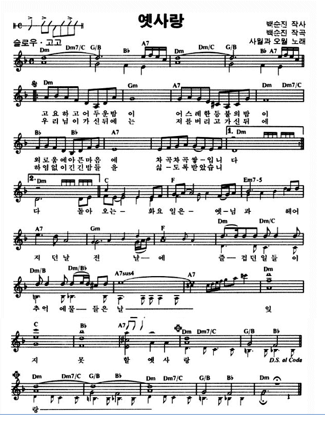 사월과 오월 시리즈#3 옛사랑(1975)가사/악보/김소월시/가곡 작성자함진호|작성시간10.10.02|조회수3,558 목록 댓글 8 글자크기 작게가 글자크기 크게가 옛 사랑 -사월과 오월- 고요하고 어두운 밤이어스레한 등불의 밤이외로움에 아픈 마음에차곡 차곡 쌓~입니다우리 님이 가신 뒤에는저를 버리고 가신 뒤에하염없이긴 긴 밤들~을싫~도록 받았습니다돌아오는 화요일은옛님과 헤어지던 날전날~에 즐겁던 일들이추억에 물들은 날잊지 못할 옛사랑돌아오는 화요일은옛님과 헤어지던 날전날~에 즐겁던 일들이추억에 물 들은 날잊지 못할 옛사랑 원작은 김소월의 시 '옛이야기' 이다. 옛이야기 - 김소월 - 고요하고 어두운 밤이 오면은 어스레한 등불에 밤이 오면은 외로움에 아픔에 다만 혼자서 하염없는 눈물에 저는 웁니다 제 한 몸도 예전엔 눈물 모르고 조그만한 세상을 보냈습니다 그 때는 지난날의 옛이야기도 아무 설움 모르고 외웠습니다 그런데 우리 님이 가신 뒤에는 아주 저를 버리고 가신 뒤에는 전날에 제게 있던 모든 것들이 가지가지 없어지고 말았습니다 그러나 그 한 때에 외워 두었던 옛이야기뿐만은 남았습니다 나날이 짙어가는 옛이야기는 부질없이 제 몸을 울려 줍니다 김소월의 시를 붙인 가곡 '옛이야기' 옛사랑 기타악보 사월과 오월 노래는 9기 한철희네 집에가서 많이 불렀던 노래들이다. 다음검색 현재 게시글 추가 기능 열기 북마크 공유하기 신고 센터로 신고 댓글 댓글 8 댓글쓰기 답글쓰기 댓글 리스트 답댓글 작성자함진호 작성자 본인 여부 작성자 | 작성시간 10.10.02 뭔소리? 답댓글 작성자lsy24 | 작성시간 10.10.06 느끼고 있느라고 옛사랑 나오면 느낄줄 알아야지 으믕믕 업어졌다 글씨 ㅎㅎㅎ 작성자종수 | 작성시간 10.10.03 누를 곳이 없는데... ??? 답댓글 작성자함진호 작성자 본인 여부 작성자 | 작성시간 10.10.04 난 학원컴에서도 나오고 집에서도 잘 나오던데 .윈도우버젼이 달라서일까? 작성자patriot1985 | 작성시간 10.10.05 가을이니까 사랑하는 사람들과 이 사랑스런 노래들 함께 불러볼 기회가...... 댓글 전체보기 맨위로 카페 검색 취소 카페 검색어 입력폼 검색 검색어 지우기 답글 제목댓글(0)