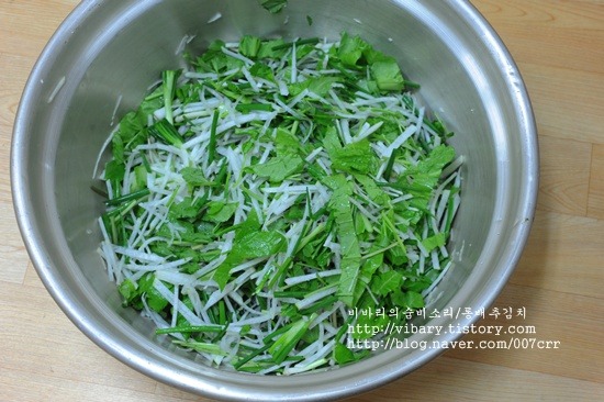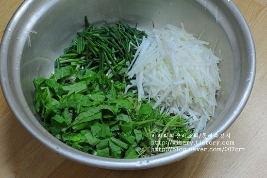부재료: 미나리2줌, 쪽파1/2단, 무1개(작은거), 청갓2줌,