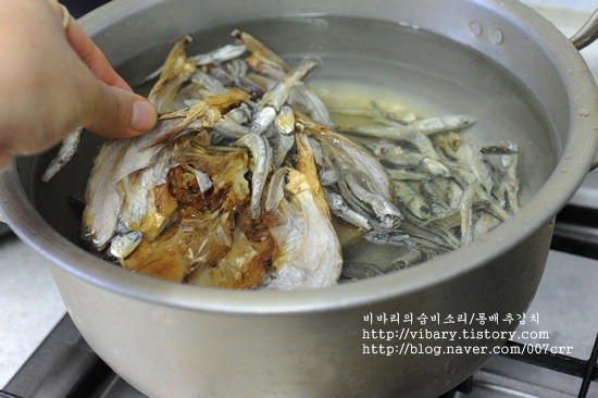1, 북어머리2개와, 국물용멸치, 다시마, 무1조각을 넣고 팔팔 끓여서 걸러낸다.