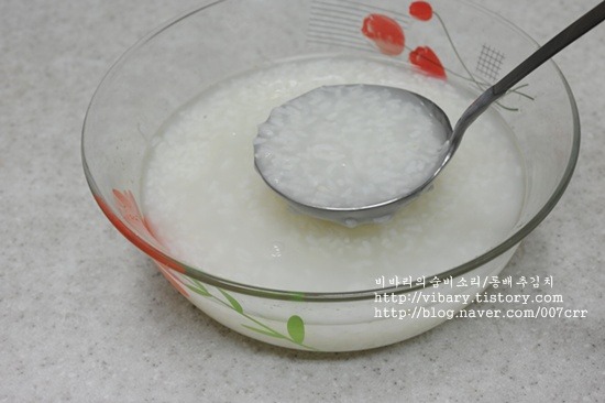 2, 찹쌀가루를 물에 푹 불렸다가 10배의 물을 넣고 묽은죽을 끓여 식힌다.