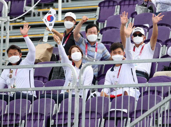 김제덕을 비롯한 양궁 대표팀이 여자 양궁 개인전 16강전을 바라보며 응원하고 있다. 도쿄 | 연합뉴스