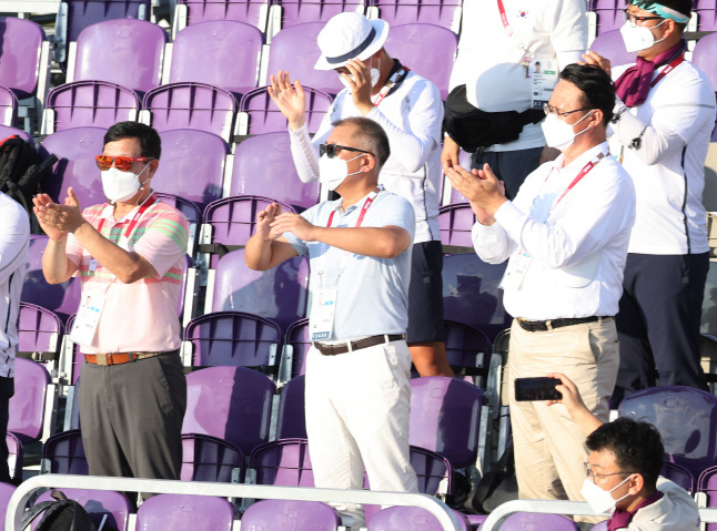 정의선 현대차그룹 회장이 25일 일본 유메노시마 공원 양궁장에서 열린 도쿄올림픽 여자 양궁 단체전에서 양궁 여자 대표팀이 금메달을 획득하자 박수를 치고 있다. 도쿄 | 연합뉴스