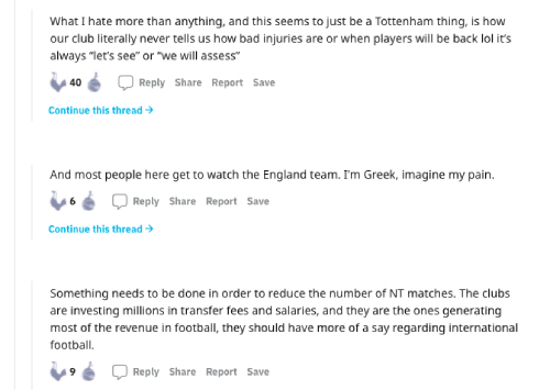 같은 게시글에 한 누리꾼은 “토트넘 특유의 방식인 것 같은데 내가 무엇보다 가장 싫은 건 구단이 팬들에게 아무것도 알려주지 않는다는 사실”이라는 댓글을 달았다. 그는 “선수들의 부상이 얼마나 심한지, 이들이 언제 돌아올 수 있는지 등에 대해 구단은 늘 ‘지켜보자’거나 ‘검토해볼 것’이라고만 한다”고 비판했다.