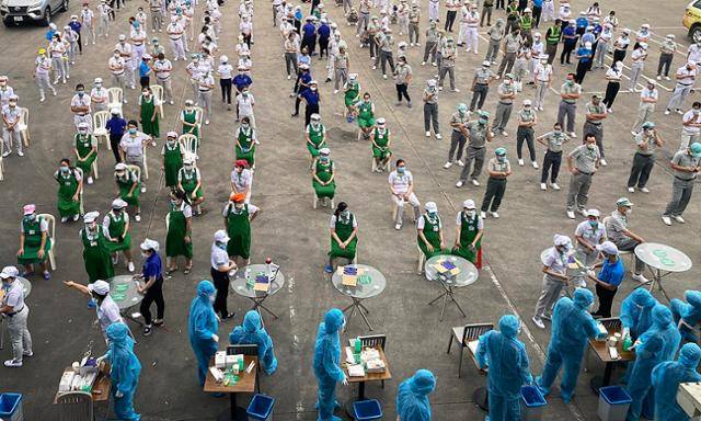 지난 16일 호찌민 내 투득시의 시민들이 자국 방영당국의 코로나19 검사를 받기 위해 대기하고 있다. VN익스프레스
