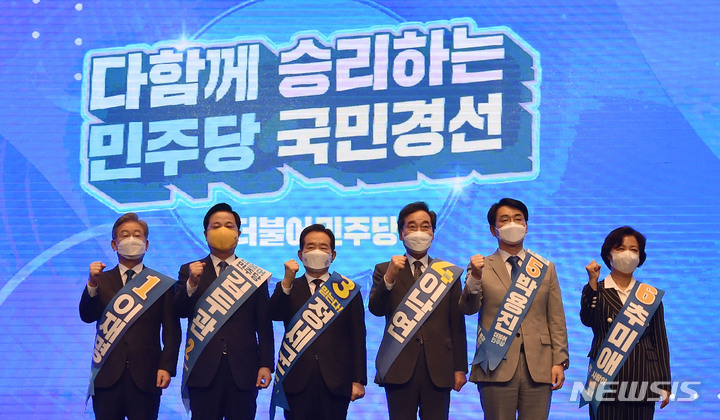 12일 1차 슈퍼위크…64만 선거인단 표심도 공개[대구=뉴시스] 이무열 기자 = 11일 오후 대구 수성구 호텔인터불고 컨벤션홀에서 열린 더불어민주당 대선 후보자 선출을 위한 대구·경북 합동연설회에서 후보자들이 파이팅을 외치고 있다. 왼쪽부터 이재명, 김두관, 정세균, 이낙연, 박용진, 추미애 후보. 2021.09.11. lmy@newsis.com