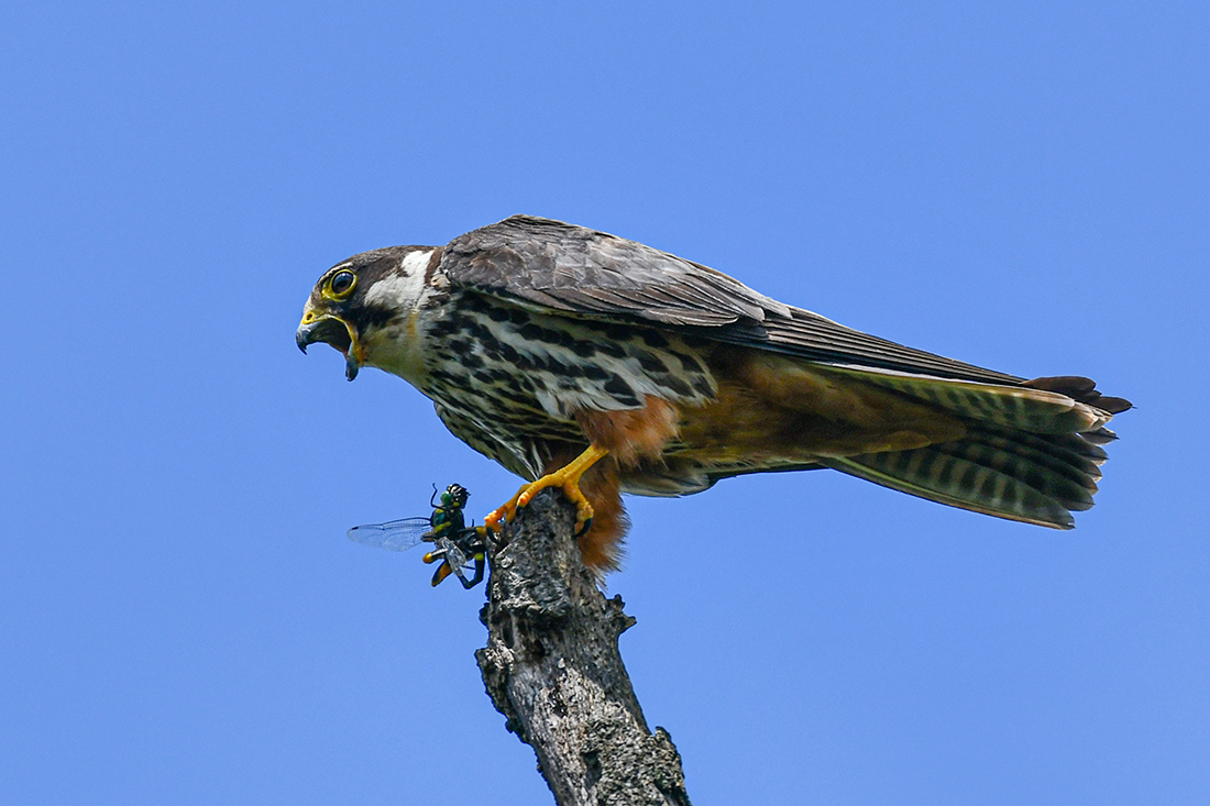 둥지근처 나무가지를 옮겨 다니며 어미새가 사냥해온 작은 새나 매미, 잠자리,