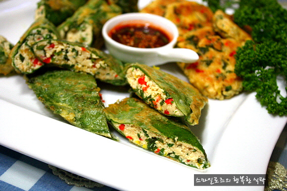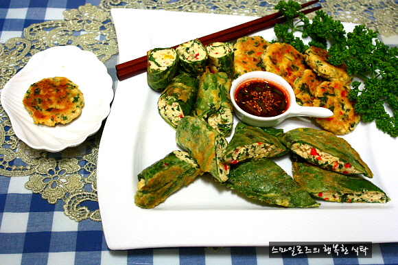 돌돌 말은 깻잎전과 반으로 접은 전을