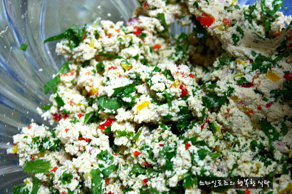 물기를 짜놓은 두부에 모든야채들을 넣고 소금 조금을 넣어서 주물러 줍니다