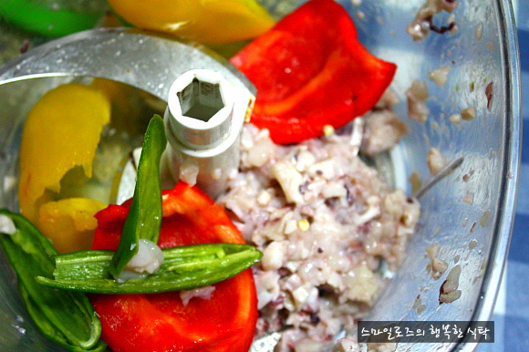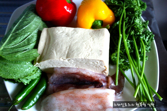 두부1/2모, 오징어 몸통만2마리, 깻잎15장, 청량고추2개, 파프리카( 레드 옐로우)반쪽씩,