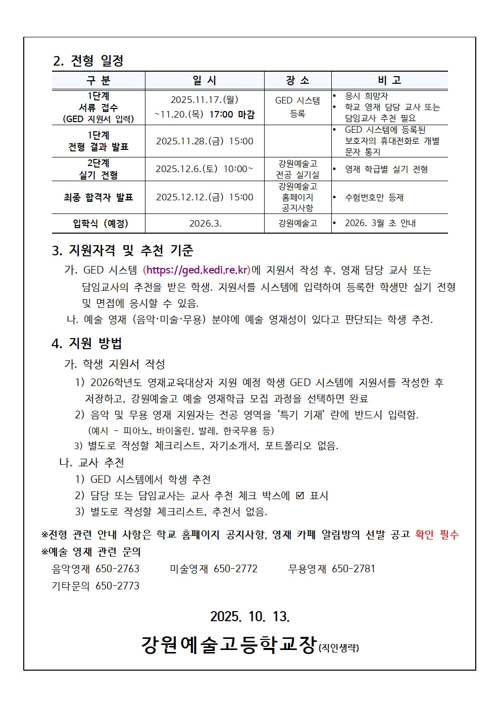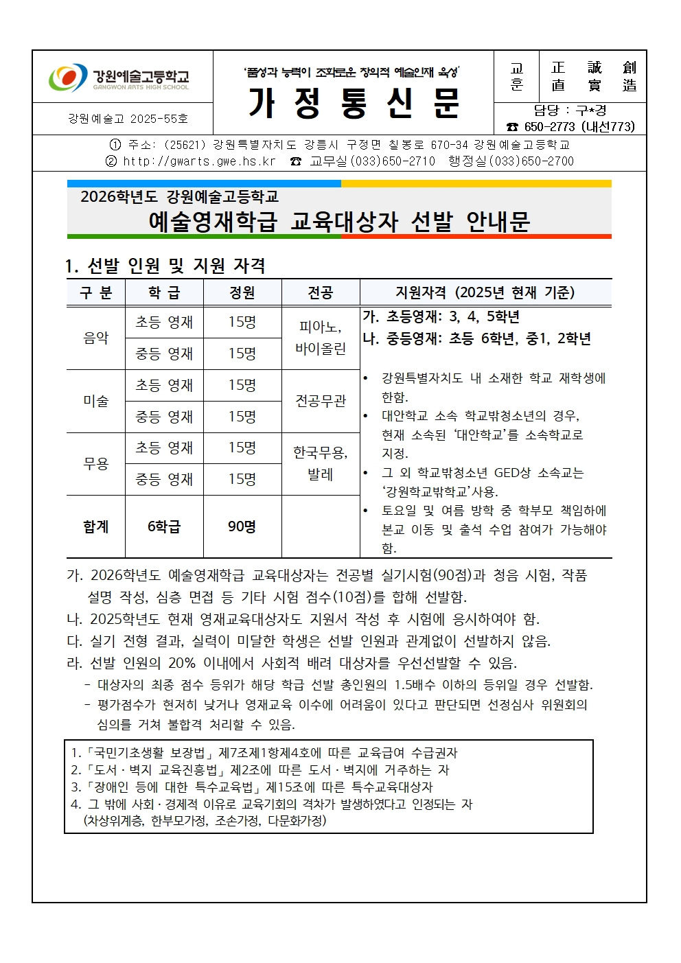 [공지] 2026학년도 강원예술고 예술영재학급 선발 일정 안내