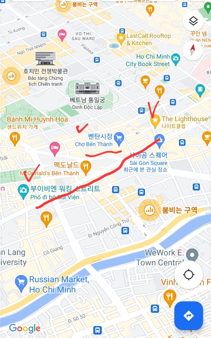 화요일 사이공 출빠겸 시티 구경도 하고싶으시다면 밑에 루트대로 부이비엔 거리 - 벤탄시장 - 라이트하우스 걸을만 합니다.