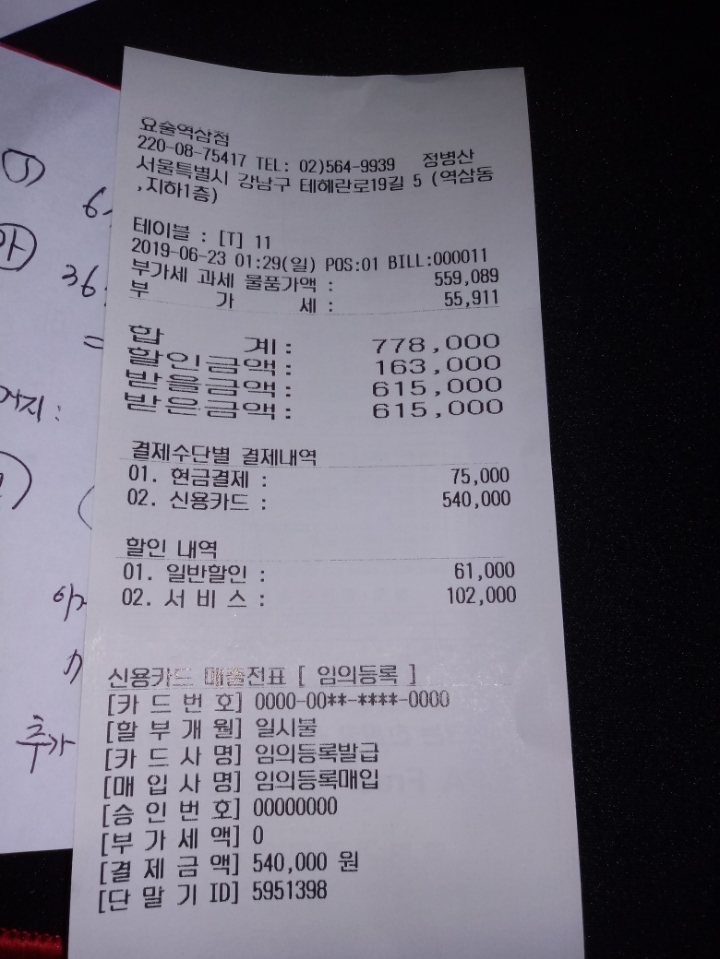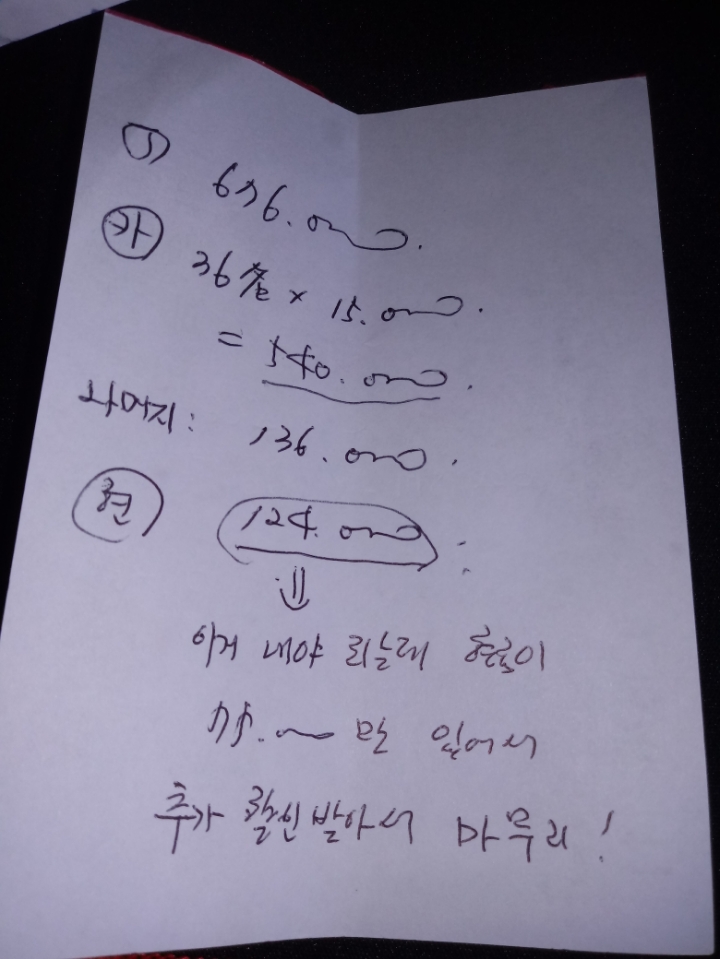 여기서 비밀 하나 두번째 사진을 보면 총 676,000원에 카드 540,000원을 내서 나머지를 현금으로 136,000원을 내야하지만 현금내면 할인이 있어서 현금으로 124,000원을 내야하지만 오버가 되건지 누가 안낸건지 모르겠지만 현금으로 75,000원만 있는 상태였습니다.