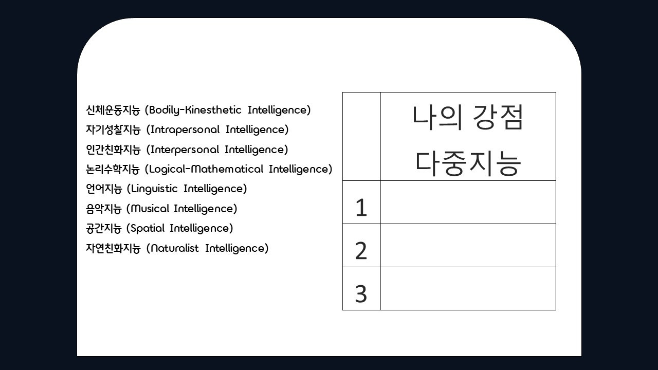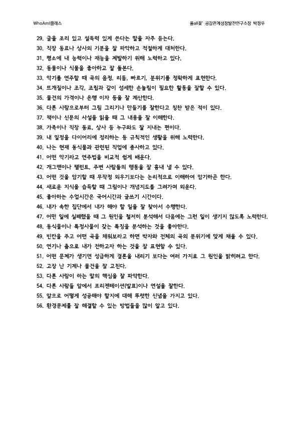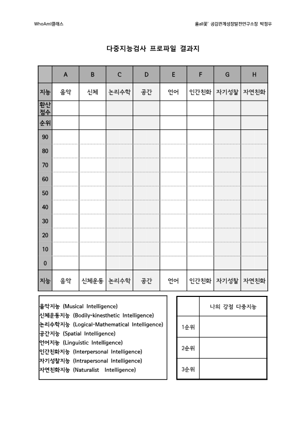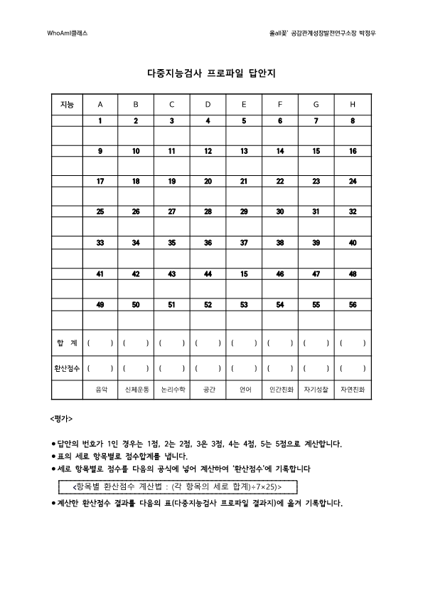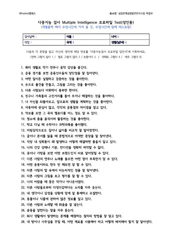 다중지능검사 샘플 작성자박정우|작성시간25.11.14|조회수39 목록 댓글 0 글자크기 작게가 글자크기 크게가 다중지능검사질문지+결과지+환산점수표.hwp76.50KB 다음검색 현재 게시글 추가 기능 열기 북마크 공유하기 신고 센터로 신고 댓글 댓글 0 댓글쓰기 답글쓰기 댓글 리스트