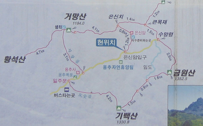 ▶등산 코스 : 용추사일주문-불당골-거망샘-거망산-장골삼거리-사평-용추마을-용추폭포-용추사일주문 도착