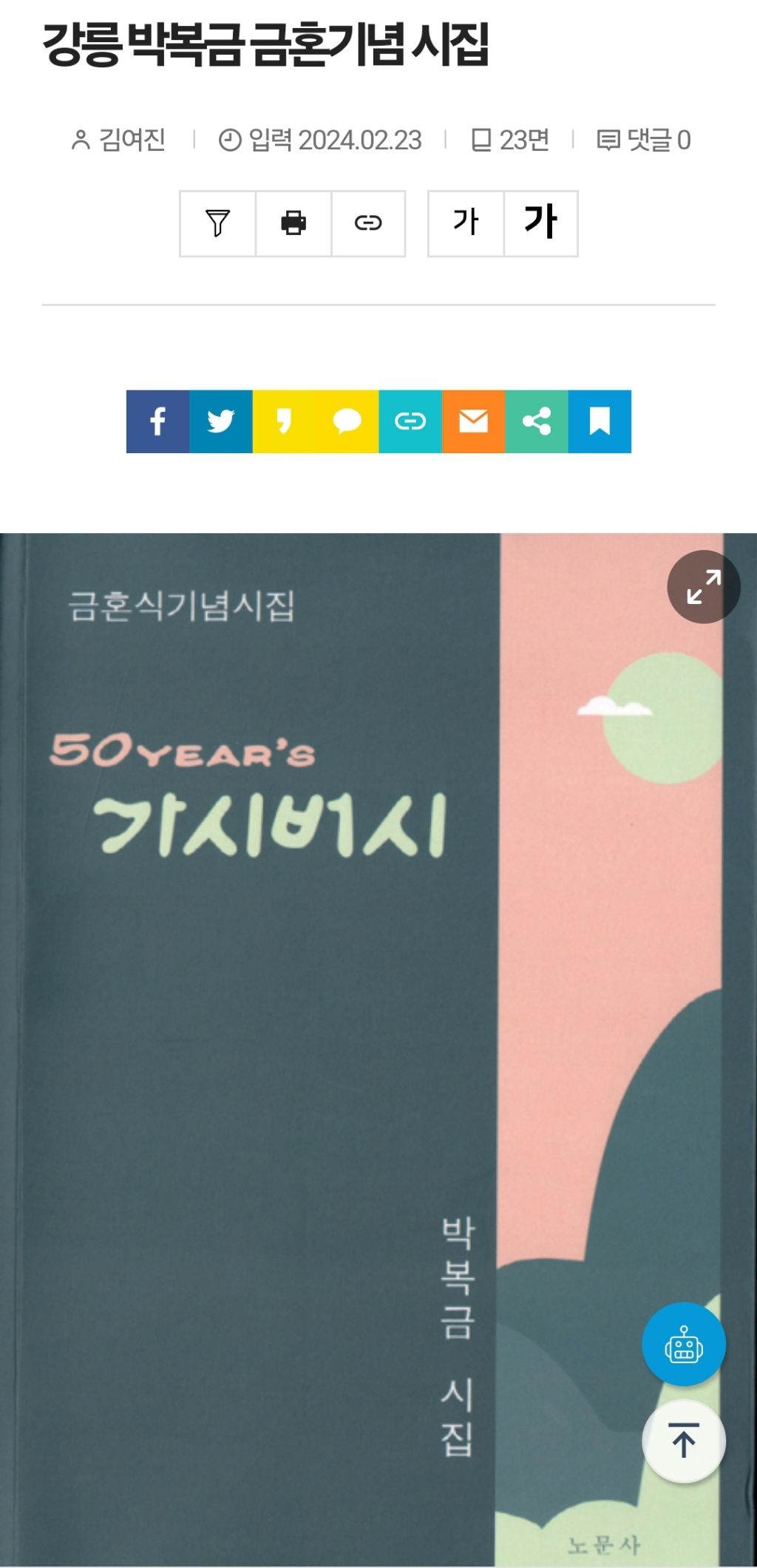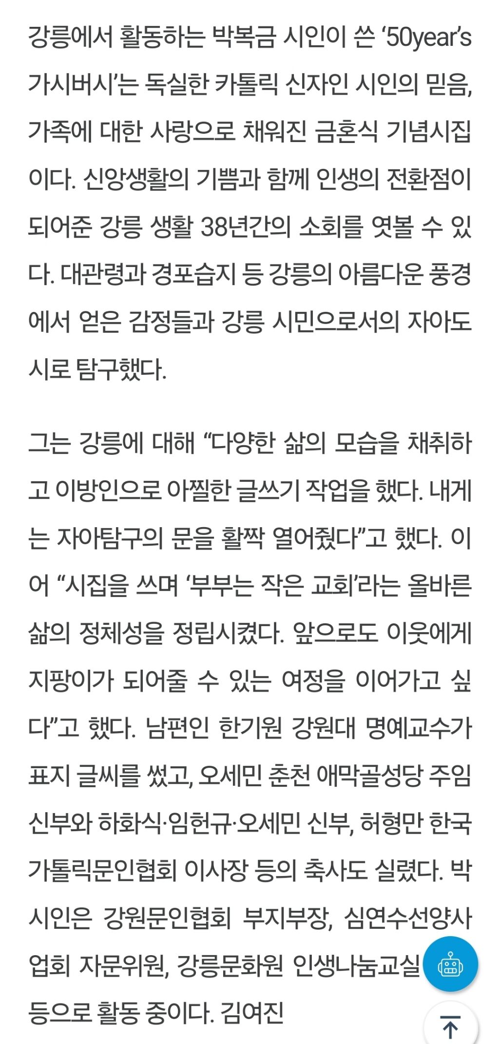 박복금 /'50year's 가시버시' 금혼식 기념시집 작성자이연희|작성시간24.02.23|조회수104 목록 댓글 3 글자크기 작게가 글자크기 크게가 강원도민일보. 2. 23 다음검색 현재 게시글 추가 기능 열기 북마크 공유하기 신고 센터로 신고 댓글 댓글 3 댓글쓰기 답글쓰기 댓글 리스트 작성자지소현/명옥) | 작성시간 24.02.23 축하드립니다 작성자원주 최승관 | 작성시간 24.02.23 금혼식기념시집 특별합니다 죽하드려요 작성자조영웅 | 작성시간 24.02.27 가족의 오롯한 사랑이 가득 담겨있네요.축하드립니다. 고맙습니다. 멋진 날 열어가세요. ^.^* 댓글 전체보기