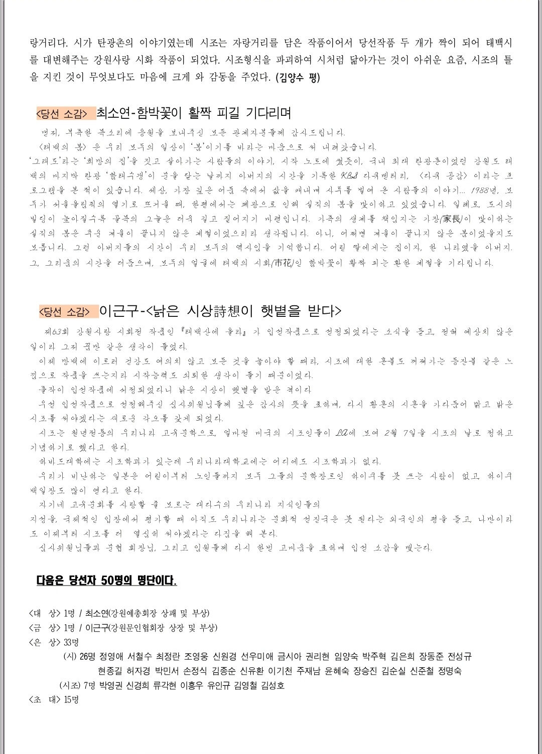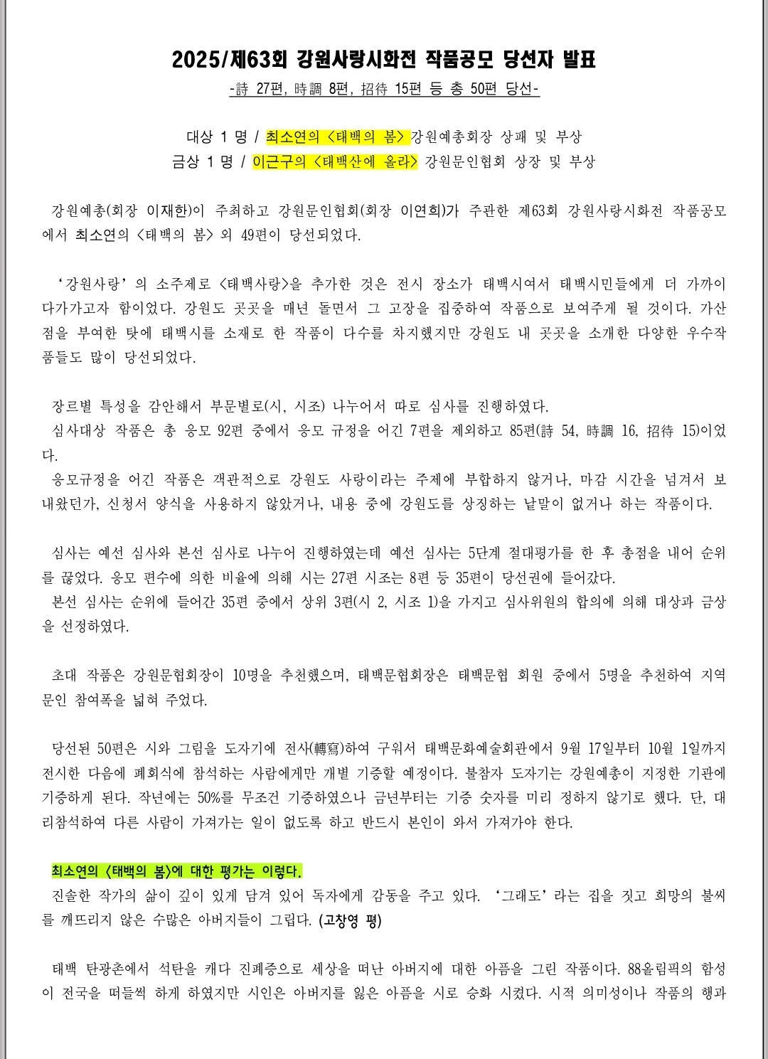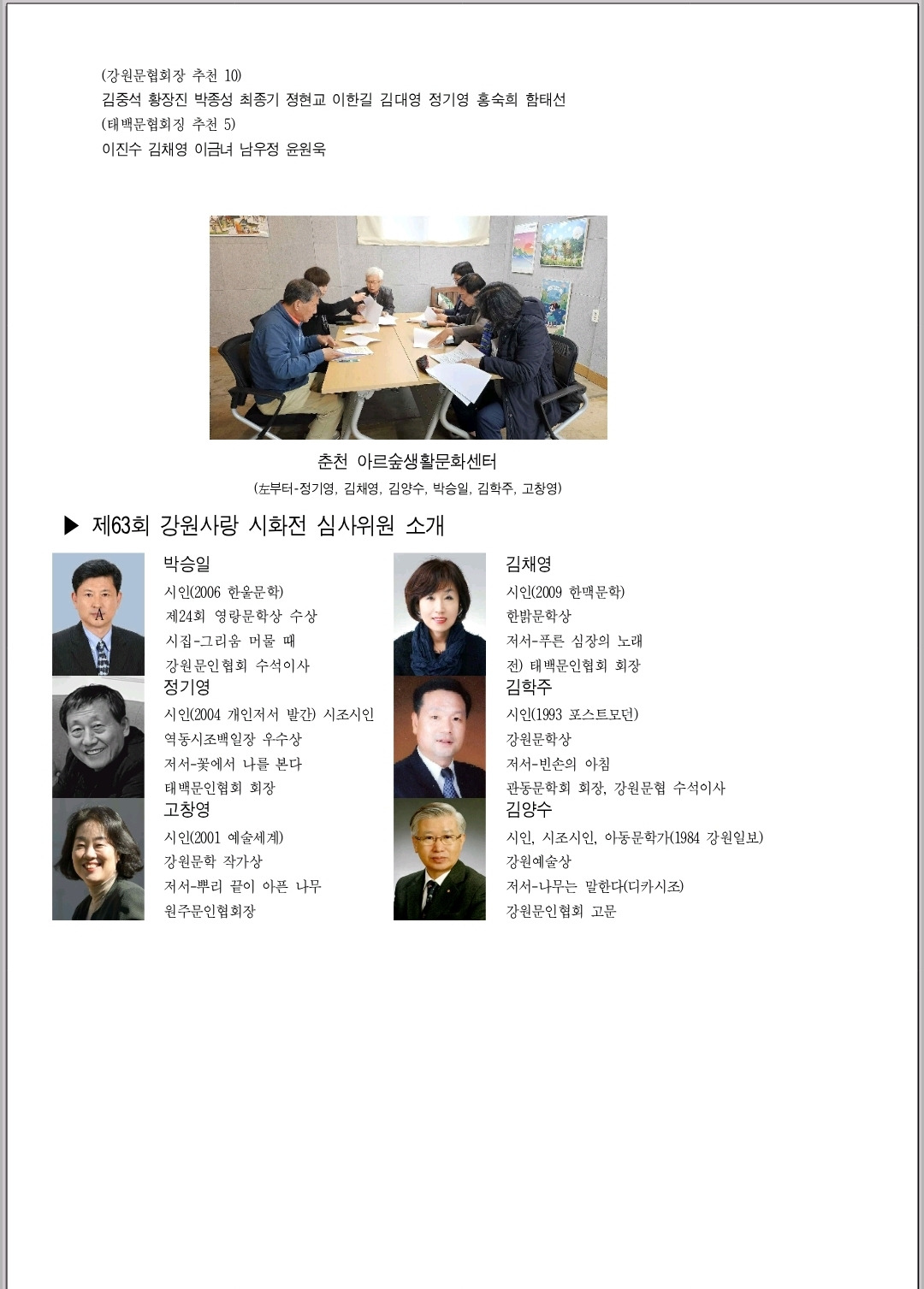 김양수 / 제63회 강원사랑시화전' 선정자 심사 발표 작성자강원문인협회|작성시간25.06.17|조회수69 목록 댓글 0 글자크기 작게가 글자크기 크게가 다음검색 현재 게시글 추가 기능 열기 북마크 공유하기 신고 센터로 신고 댓글 댓글 0 댓글쓰기 답글쓰기 댓글 리스트
