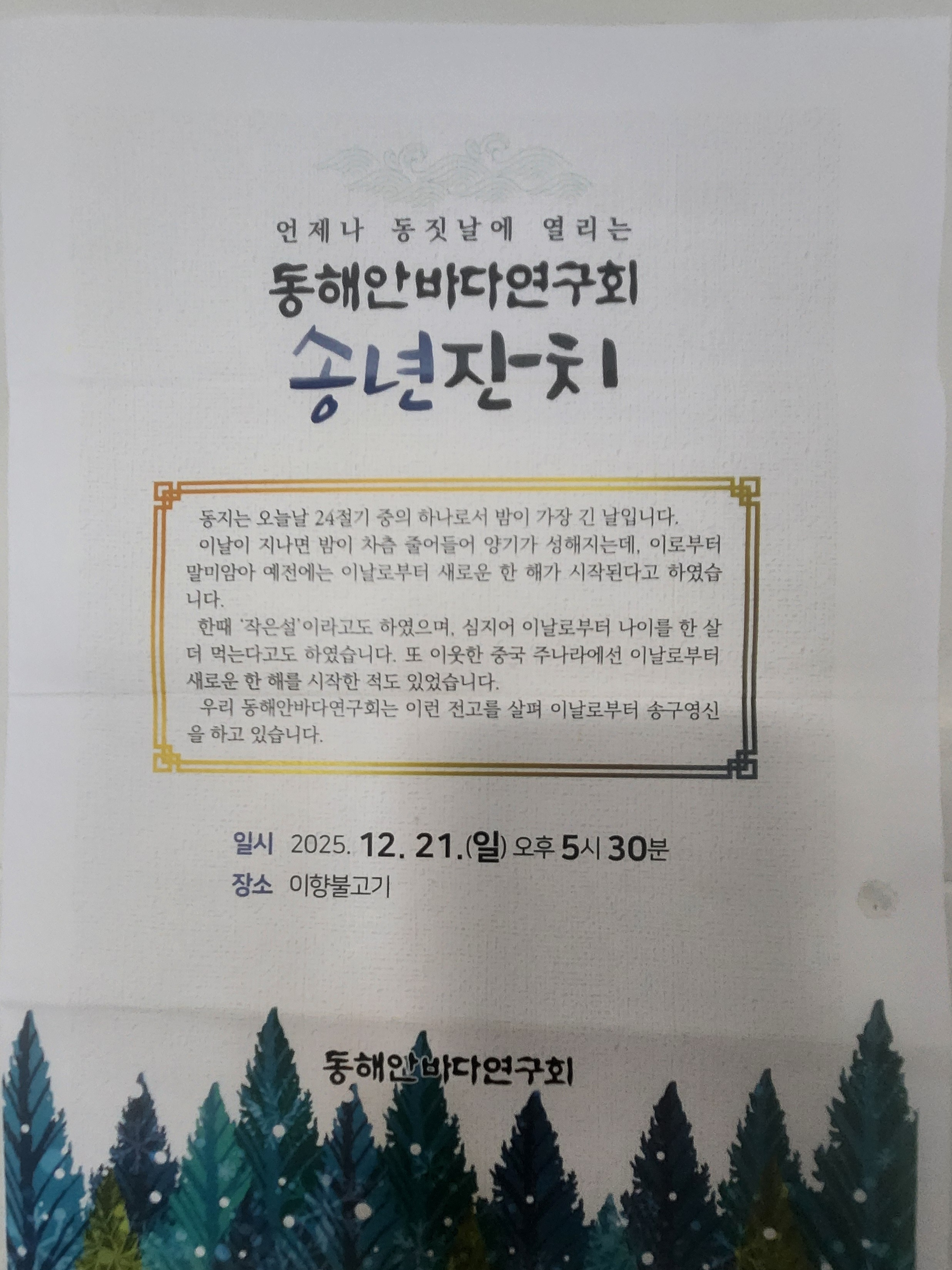 이한길(동해안바다 연구회 회장)/ 2025년 동해안바다 연구회 송년잔치 성료 작성자강원문인협회|작성시간25.12.24|조회수17 목록 댓글 0 글자크기 작게가 글자크기 크게가 다음검색 현재 게시글 추가 기능 열기 북마크 공유하기 신고 센터로 신고 댓글 댓글 0 댓글쓰기 답글쓰기 댓글 리스트