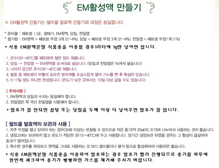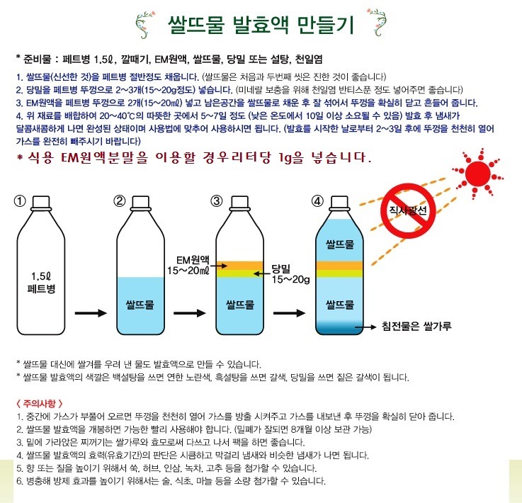 “생선구이를 한 뒤 분무기에 넣은 식용 EM원액분말 식품용으로 발효하여 만들기한 EM 발효액을 집안에 뿌려두면 금새 냄새가 사라져요. 싱크대`도마`행주 등에 뿌려두면 살균효과가 있고, 목욕이나 세수 후 헹굼물에 조금 넣으면 피부가 건강해집니다. 식용 EM원액분말을 밥할 때 한스푼 넣으면 잘 쉬지 않고, 식용 EM원액분말 식품용으로 만든 EM쌀뜨물발효액만들기하여 만든 EM발효액을 빨래할 때 섬유유연제 대신 넣으면 살균도 되고 부드러워져요.”