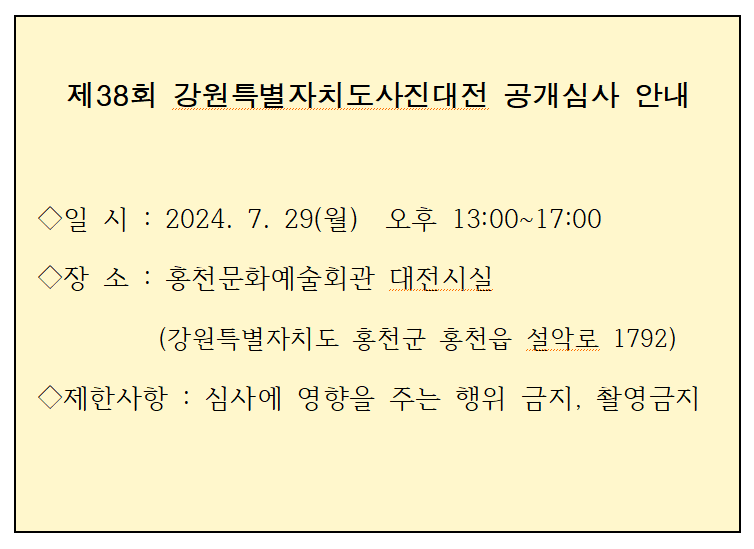 2024 제38회 강원특별자치도사진대전 공개심사 안내 작성자강원도지회장_장흥균|작성시간24.07.25|조회수151 목록 댓글 0 글자크기 작게가 글자크기 크게가 다음검색 현재 게시글 추가 기능 열기 북마크 공유하기 신고 센터로 신고 댓글 댓글 0 댓글쓰기 답글쓰기 댓글 리스트