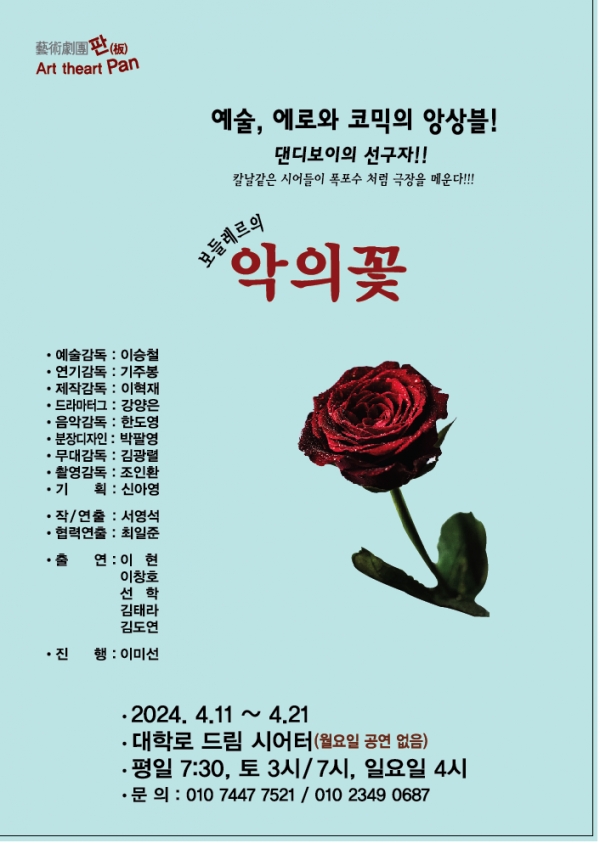 협력연출 최일준, 예술감독 이승철, 연기감독 기주봉, 제작감독 이혁재, 드라마 터그 강양은, 음악감독 한 철, 분장감독 박팔영, 무대감독 김광열, 기획 신아영 둥 스텝진의 기량도 드러나, 예술극단 판의 서영석 작 연출의 보들레르의 악의 꽃을 한편의 명작연극으로 탄생시켰다.