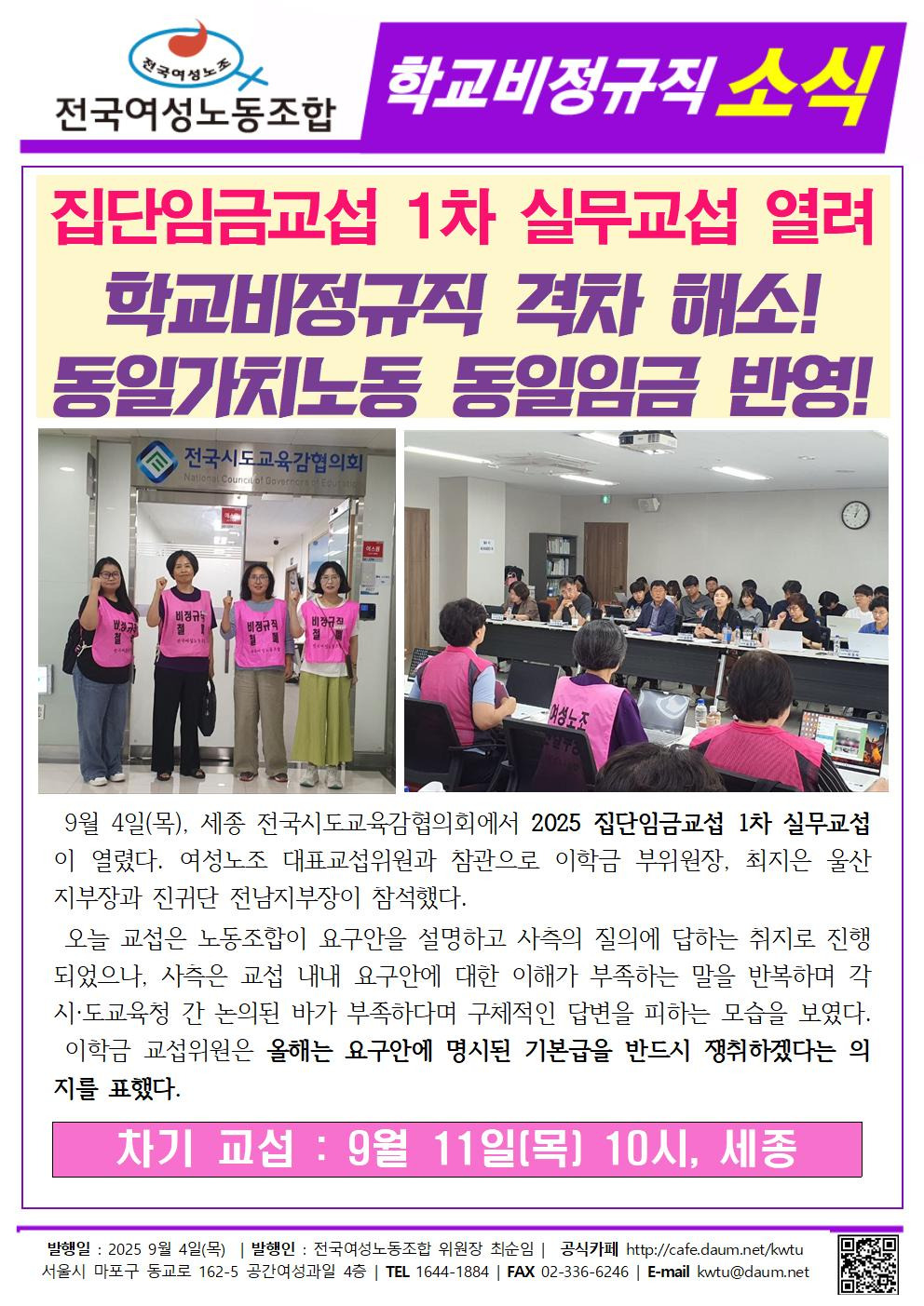 <여성노조 학비소식지> 집단임금교섭 1차 실무교섭 열려 - 학교비정규직 격차 해소! 동일가치노동 동일임금 반영!