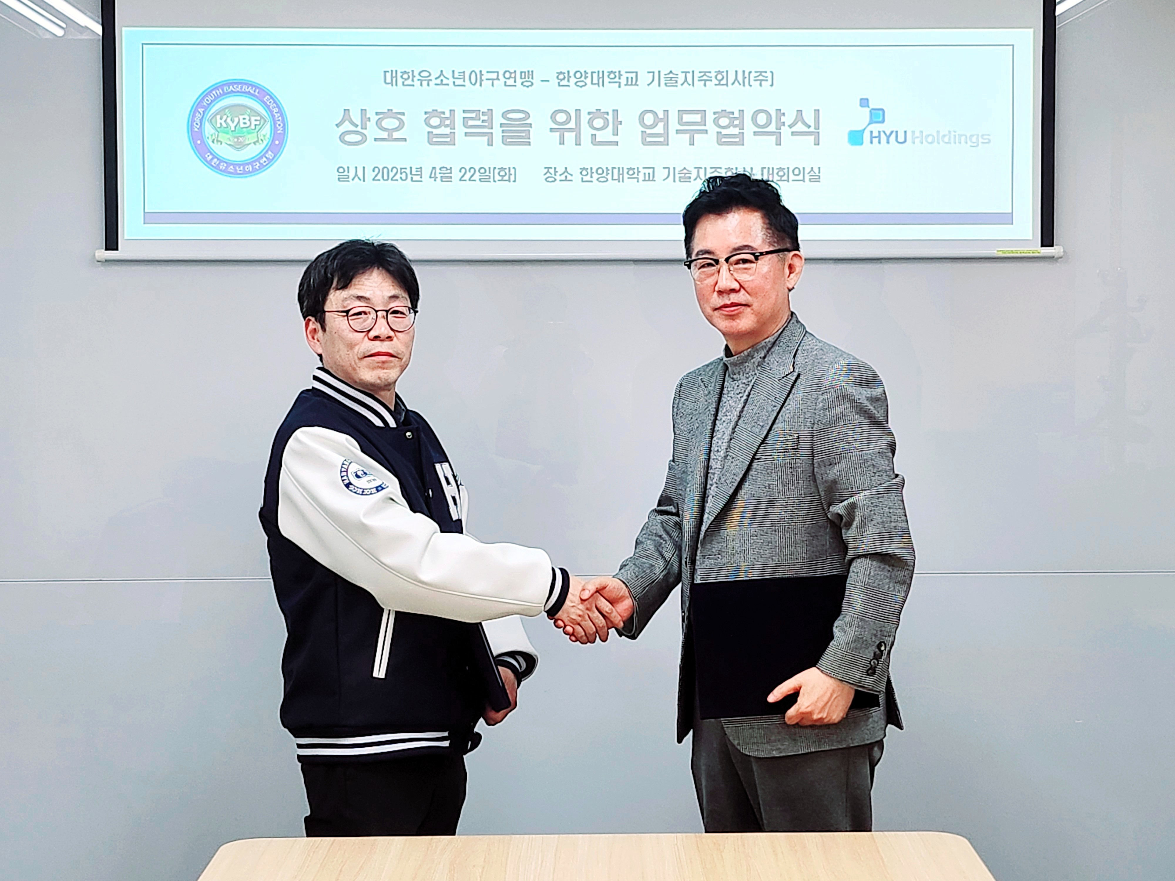대한유소년야구연맹 이상근 회장(右)과 한양대학교 기술지주회사(주) 김경원 대표이사(左)