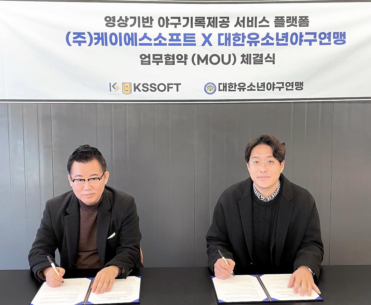 업무협약 체결 장면(이상근 대한유소년야구연맹 회장(左), 강권식 (주)케이에스소프트 대표이사(右))