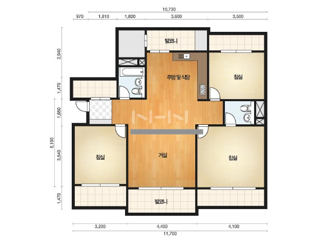 방2, 욕실1, 거실, 주방/식당, 발코니,