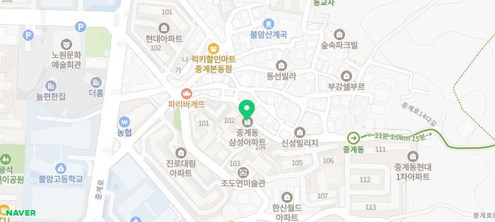 | 쇼핑ㆍ음식 | ㆍCU 노원중계점(99m) ㆍCU 중계한아름점(133m) ㆍ세븐일레븐 중계본점(226m) ㆍ이마트에브리데이 중계동점(266m) ㆍ이마트24 중계불암점(301m) ㆍGS25 중계영신점(323m) ㆍGS25 중계현대점(342m) ㆍ노브랜드 노원중계점(357m) ㆍCU 중계주공점(358m) ㆍGS25 중계주공점(383m) |