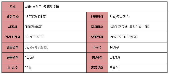 | 역세권 | ㆍ7호선 공릉 575m ㆍ6호선 화랑대 611m ㆍ7호선 태릉입구 682m ㆍ6호선 태릉입구 823m |